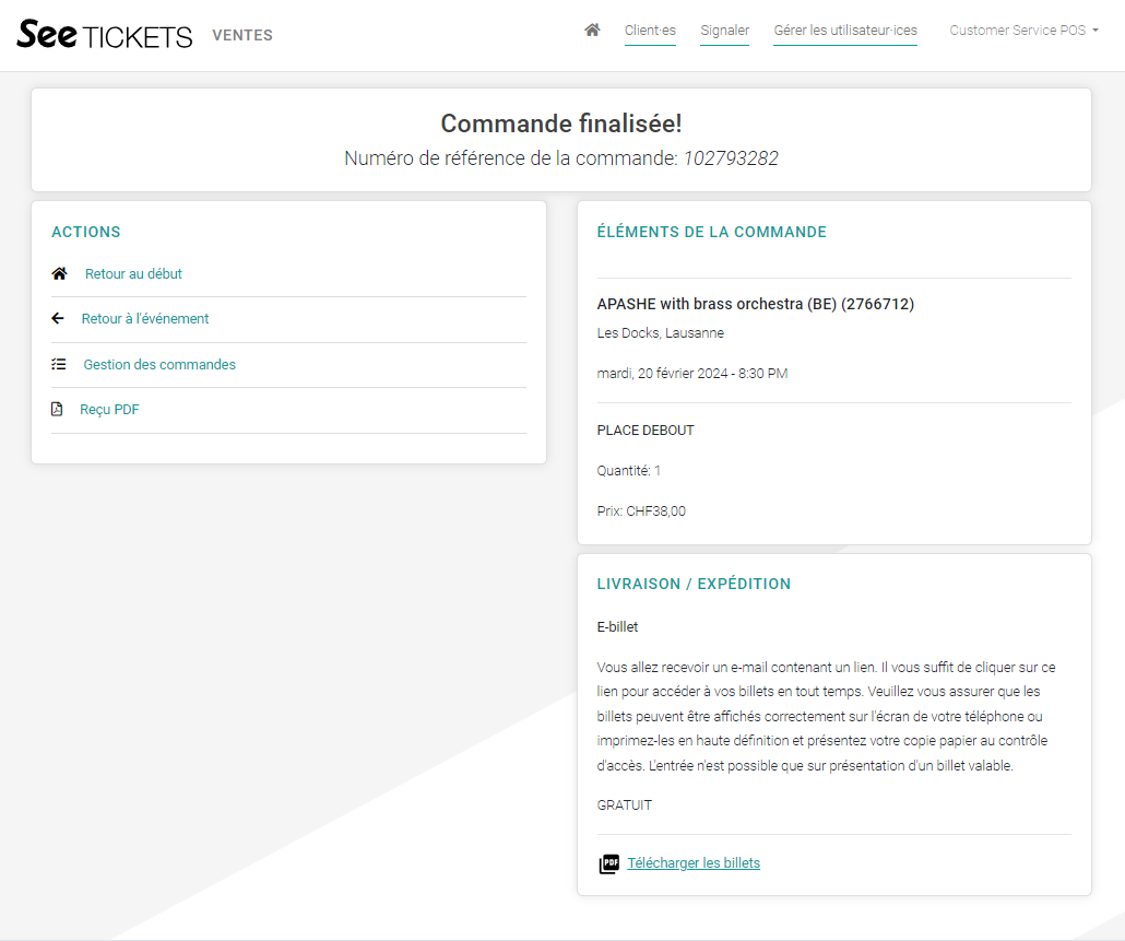 L'impression des billets se fait comme auparavant sur du papier A4 normal. Pour ce faire, cliquez sur Télécharger les billets. Le fichier PDF est enregistré localement sur votre ordinateur dans le dossier de téléchargement ou affiché dans le navigateur, d'où il peut être imprimé sans limite.