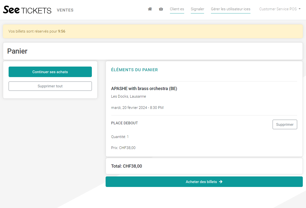 La saisie des données du client est facultative. L'avantage est que les visiteurs de l'événement seraient informés d'une éventuelle annulation, d'un report ou d'une modification. De plus, les billets sont envoyés par e-mail (dans les 2 minutes) et peuvent être présentés électroniquement sur place sur un appareil. Cliquez ensuite sur Acheter des billets pour continuer et imprimer ensuite les billets.