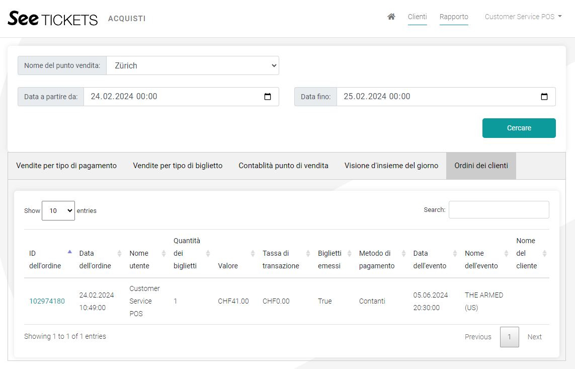 Il file PDF con i biglietti si trova solitamente nella cartella di download del proprio computer. Altrimenti, può cercare l'ordine in questione sotto Rapporto > Vendite del punto vendita > Ordini dei clienti.